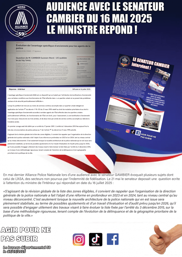 AUDIENCE AVEC LE SENATEUR CAMBIER DU NORD, LE MI REPOND En mai dernier, ALLIANCE Police Nationale lors d’une audience avec le sénateur GAMBIER évoquait plusieurs sujets dont celui de L’ASA, des secteurs non pourvus par l’indemnité de fidélisation... Publication : 17 juillet 2025 Lire la suite... Nord, Bureau Régional, Hauts de France