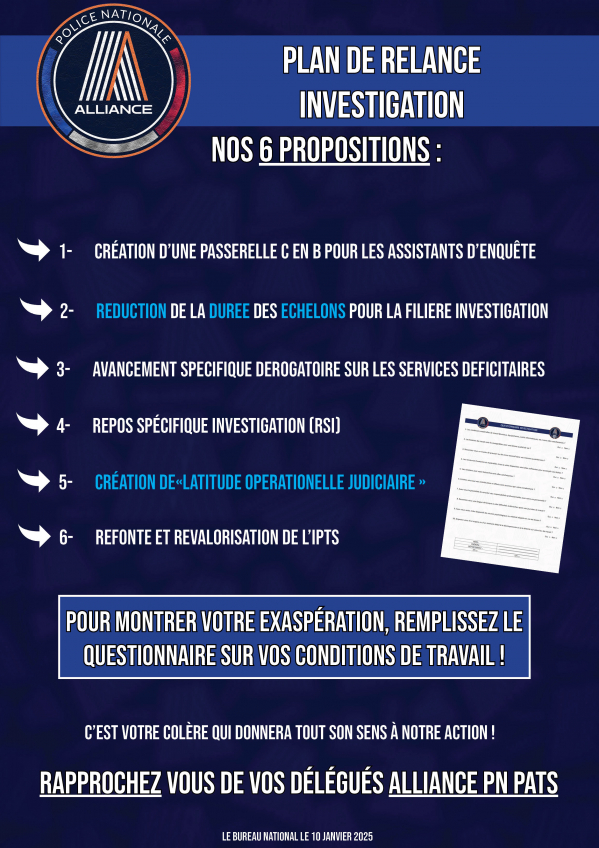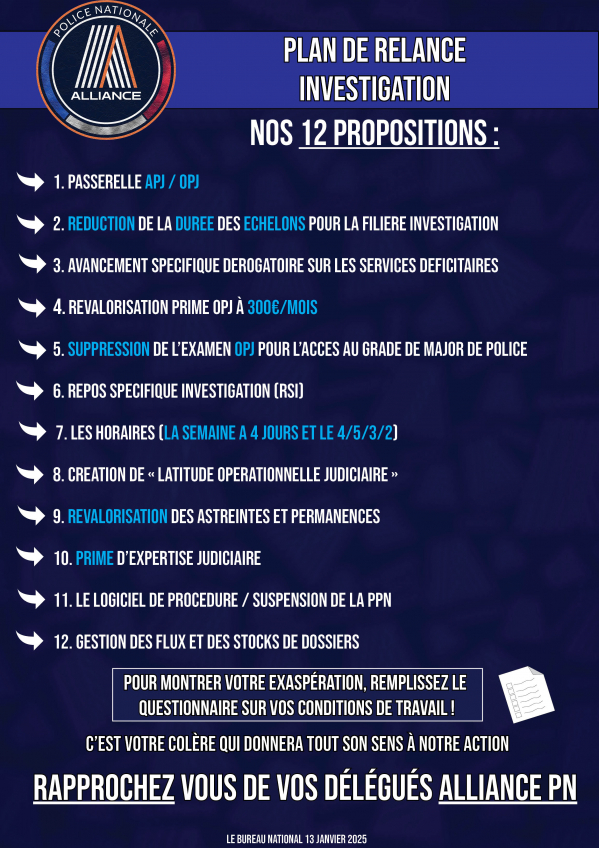 Plan de relance investigation Consultez une de nos 12 propositions Pour montrer votre exaspération, remplissez le questionnaire sur vos conditions de travail ! c’est votre colère qui donnera tout son sens à notre action Rapprochez vous de vos délégués Alliance Pn Publication : 13 janvier 2025 Lire la suite... Bureau National