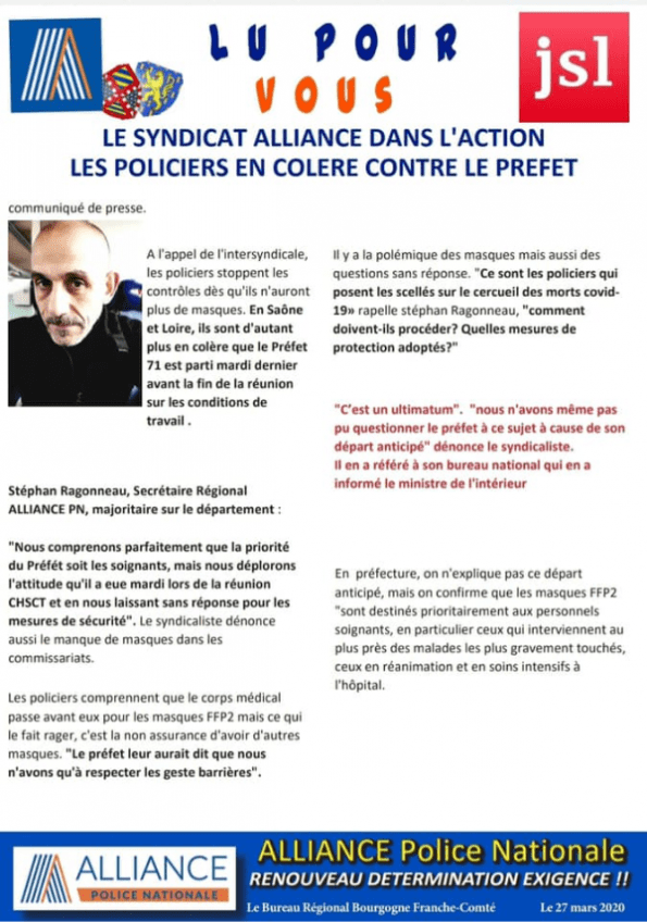 LE SYNDICAT ALLIANCE DANS L'ACTION LE SYNDICAT ALLIANCE DANS L'ACTION LES POLICIERS EN COLERE CONTRE LE PREFET Publication : 27 mars 2020 Lire la suite... Bureau Régional